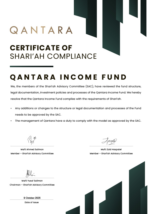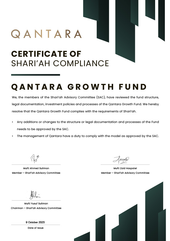 Qantara Private Capital is Shari’ah certified, by qualified boards, ensuring that our products, operations, and governance fully comply with Islamic law while upholding accountability, integrity, and investor confidence.